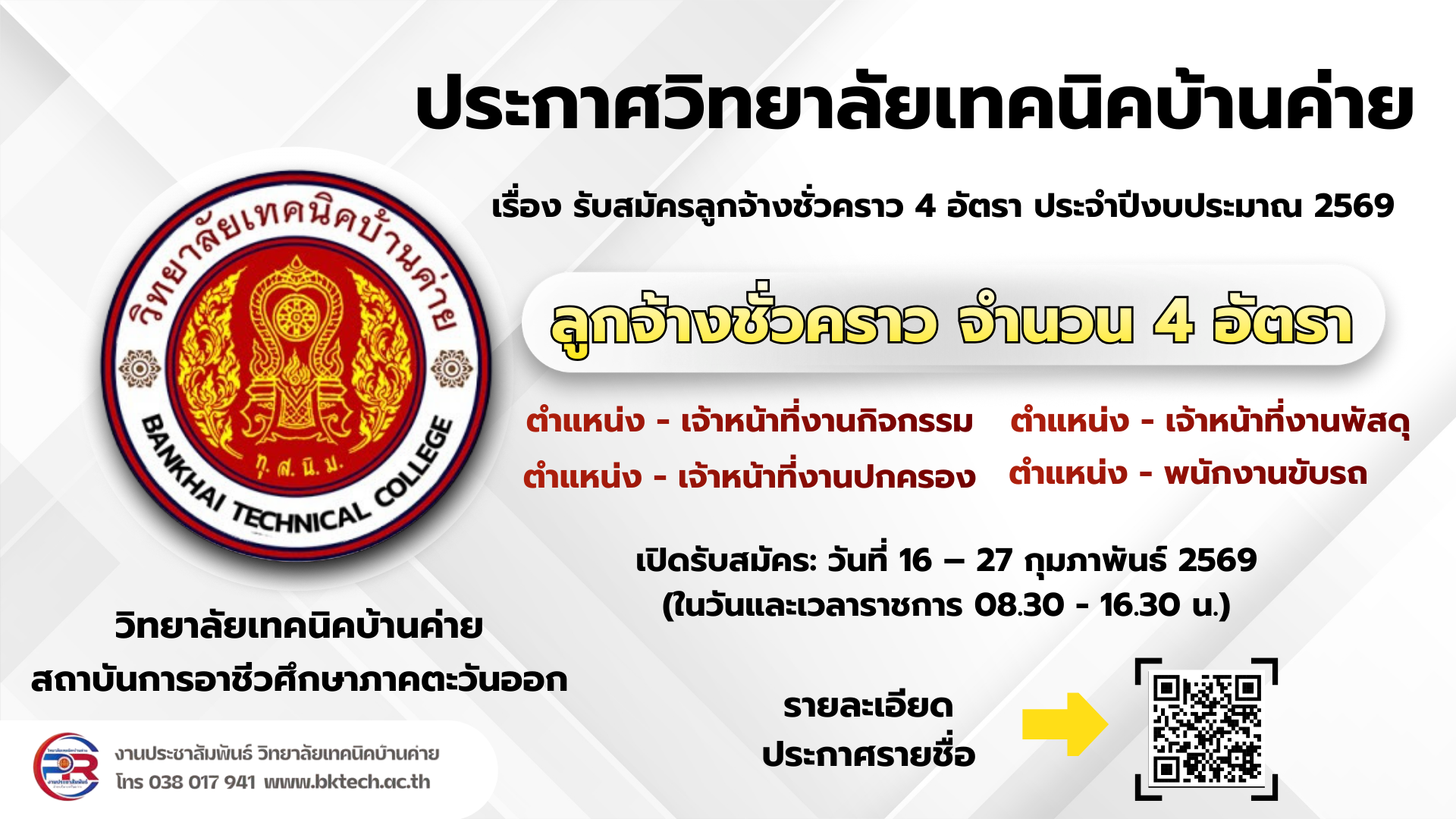 วิทยาลัยเทคนิคบ้านค่าย เปิดรับสมัครลูกจ้างชั่วคราว 4 อัตรา ประจำปีงบประมาณ 2569