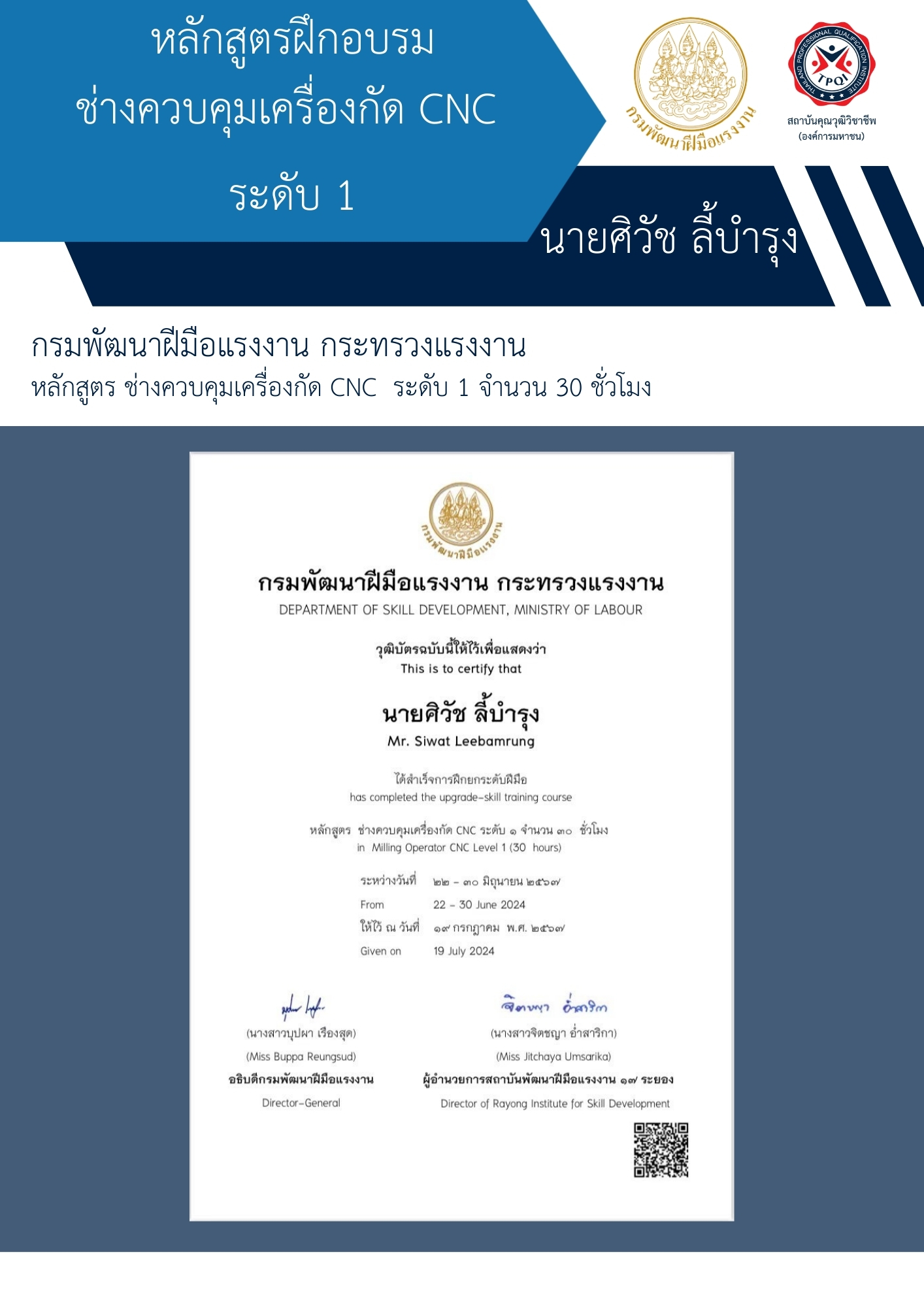 หลักสูตร ช่างควบคุมเครื่องกัด CNC ระดับ 1 จำนวน 30 ชั่วโมง