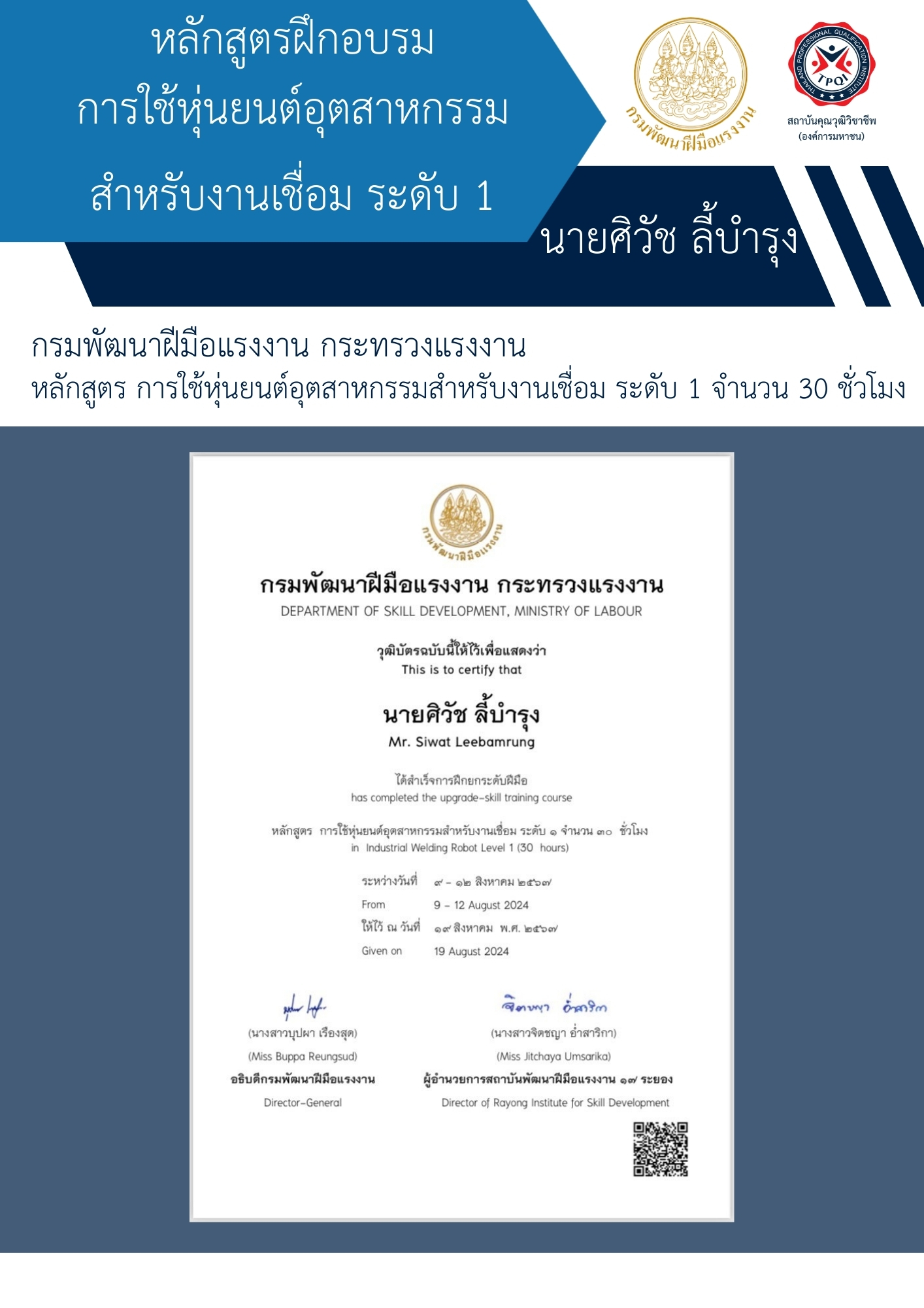 หลักสูตร การใช้หุ่นยนต์อุตสาหกรรมสำหรับงานเชื่อม ระดับ 1 จำนวน 30 ชั่วโมง