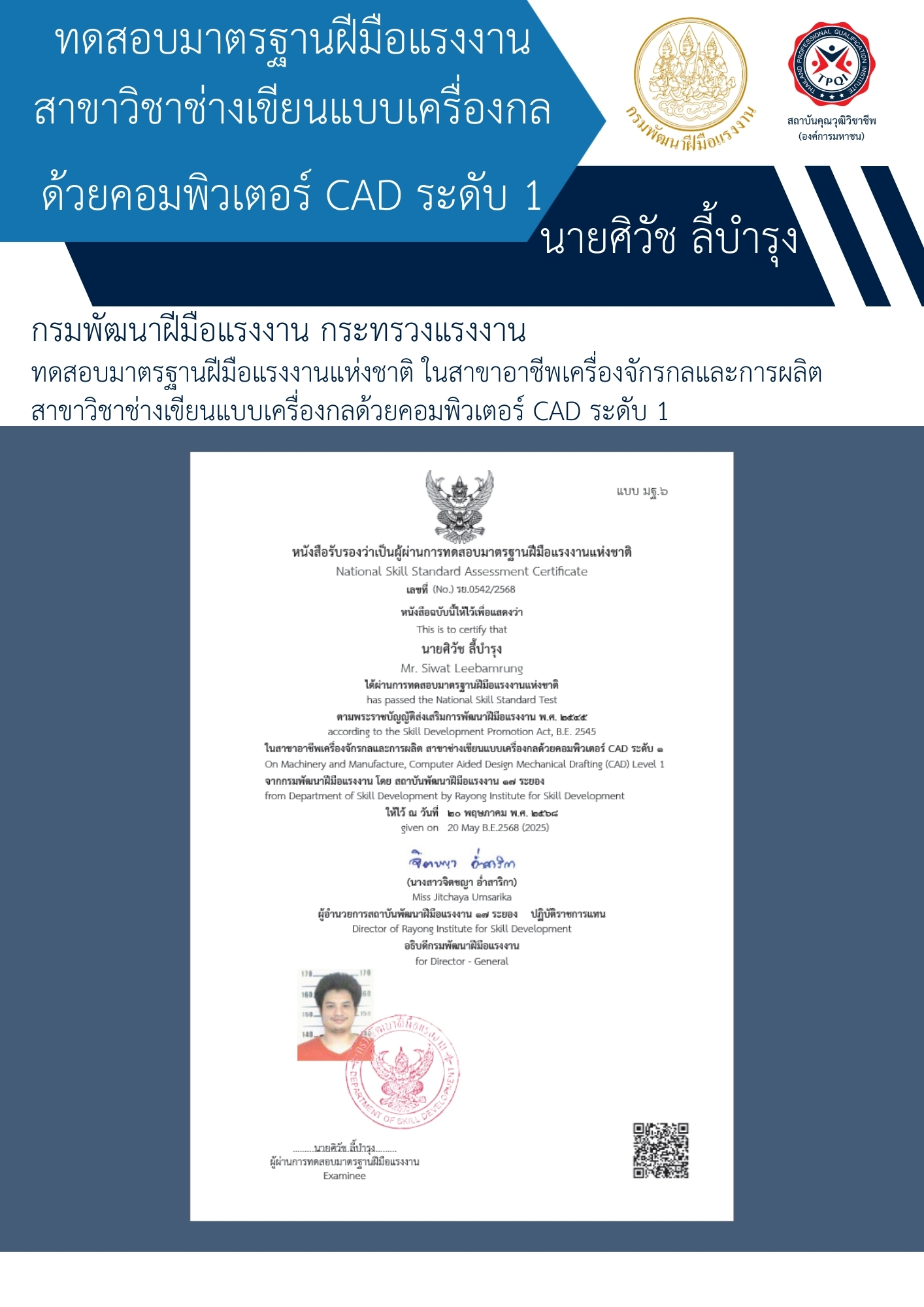 ทดสอบมาตรฐานฝีมือแรงงานแห่งชาติ ในสาขาอาชีพเครื่องจักรกลและการผลิต สาขาวิชาช่างเขียนแบบเครื่องกลด้วยคอมพิวเตอร์ CAD ระดับ 1