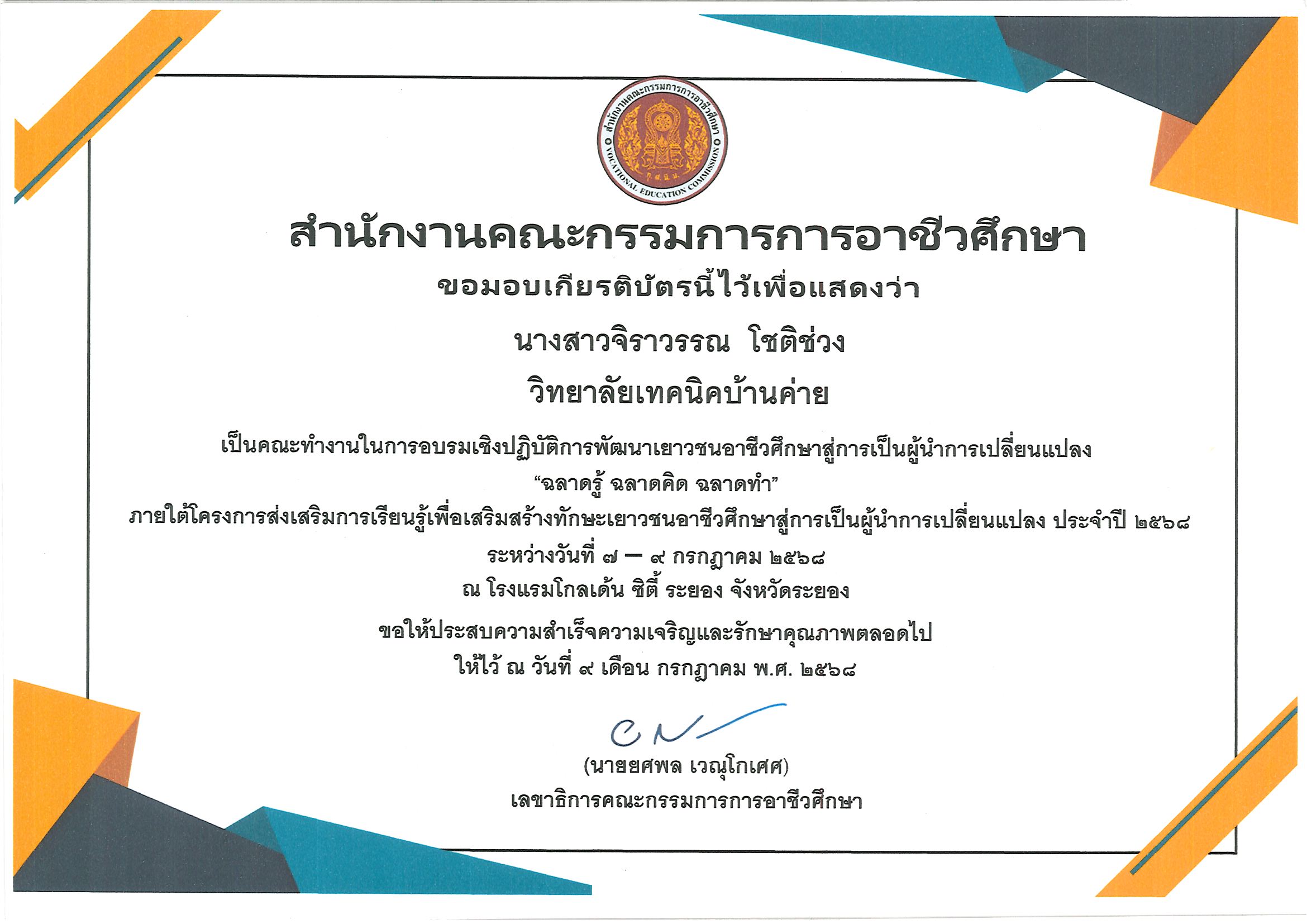 -ใบประกาศนียบัตร โครงการส่งเสริมการเรียนรู้เพื่อส่งเสริมทักษะเยาวชนอาชีวศึกษา สู่การเป็นผู้นำการเปลี่ยนแปลง 'ฉลาดรู้ ฉลาดคิด ฉลาดทำ'ประจำปีการศึกษา 2568