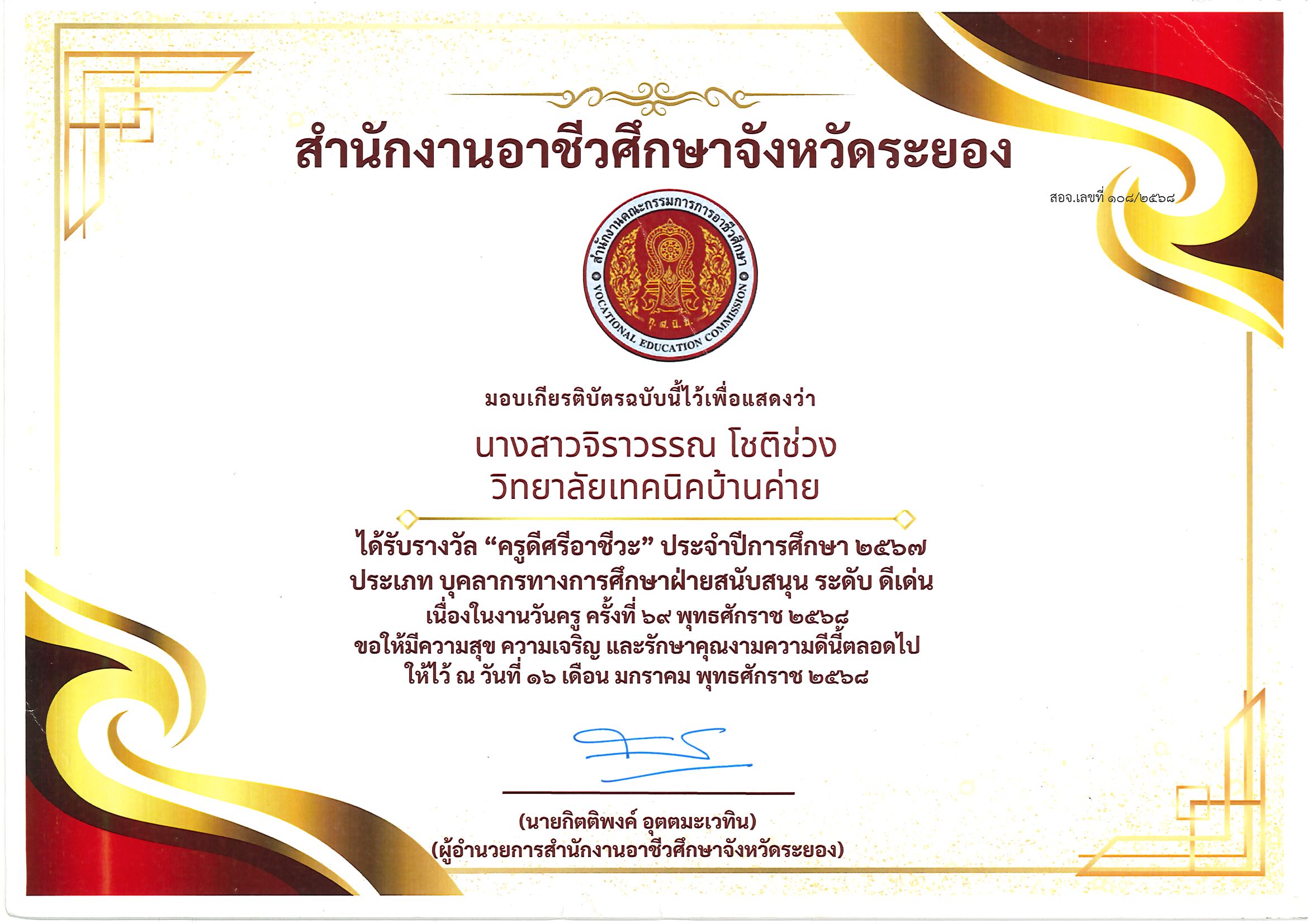 -ใบประกาศนียบัตร บุคลการทางด้านฝ่ายสนับสนุนระดับดีเด่น 'ครูดีศรีอาชีวะ'
