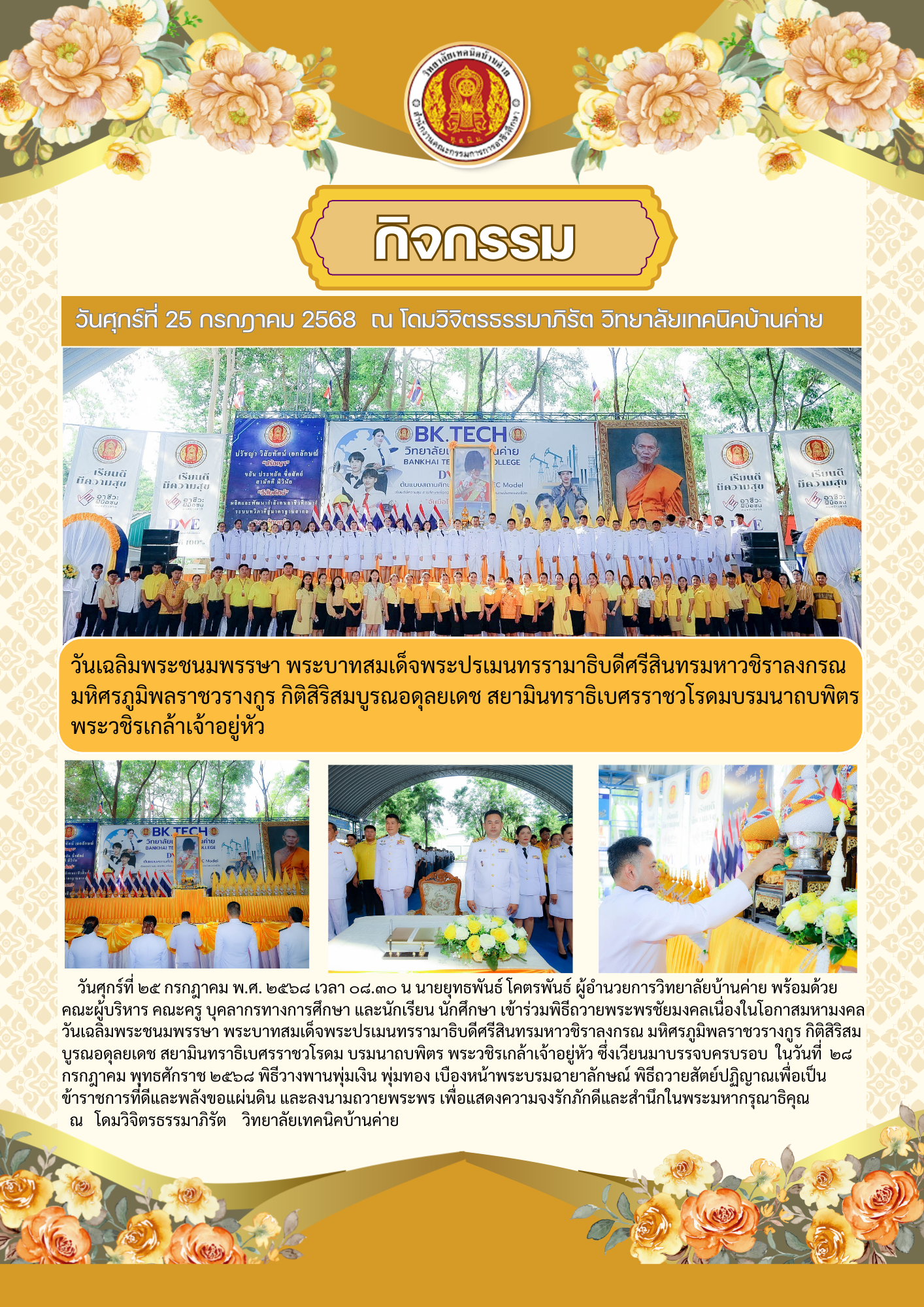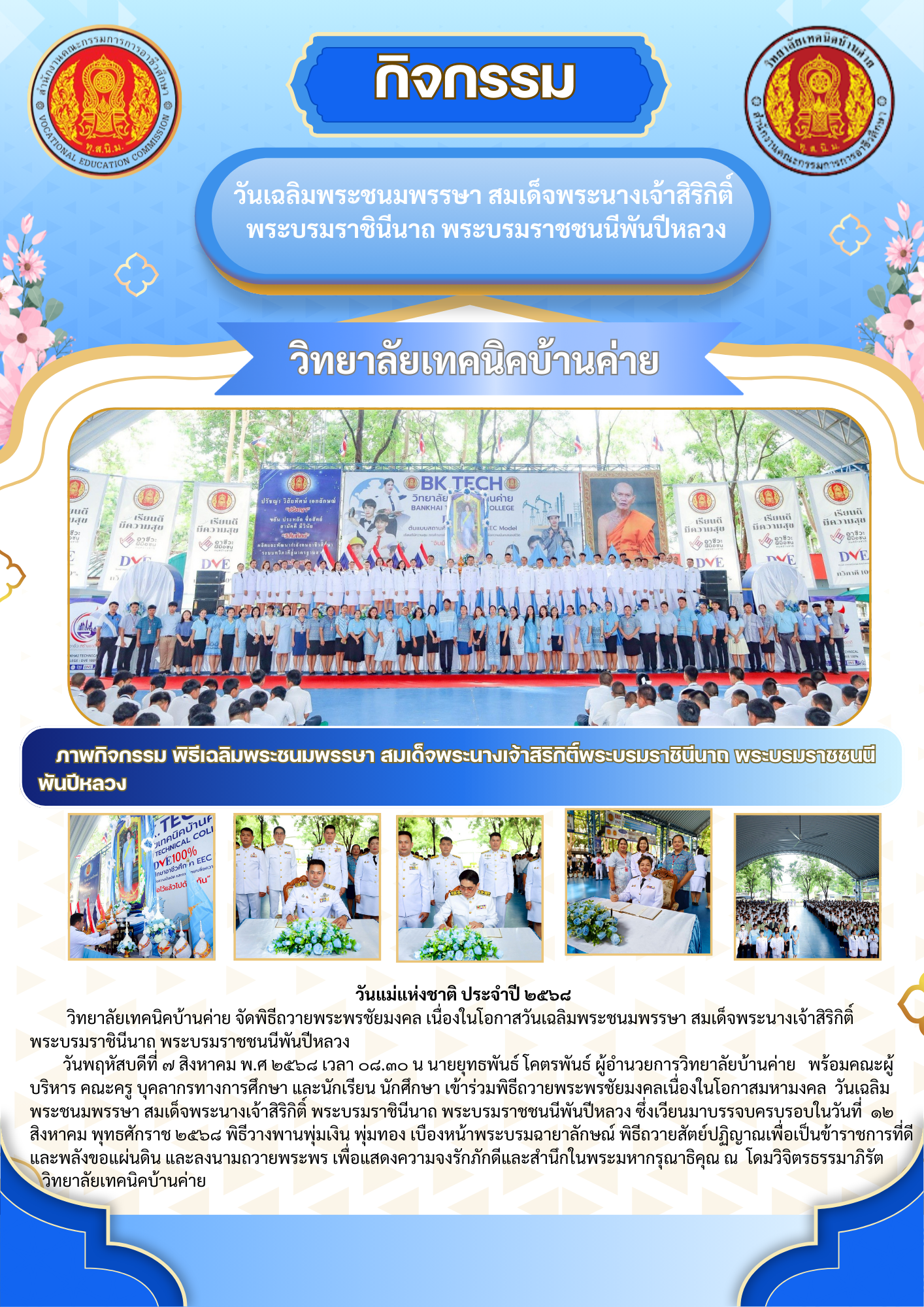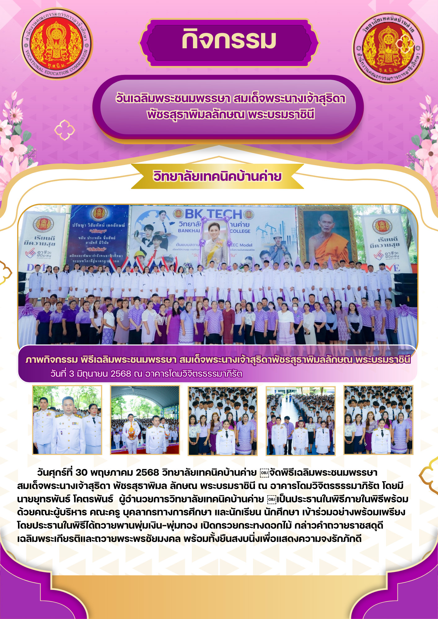วิทยาลัยเทคนิคบ้านค่าย จัดพิธีถวายพระพรชัยมงคล สมเด็จพระนางเจ้าสุทิดา พัชรสุธา พิมลลักษณ พระบรมราชินี เนื่องในวโรกาสวันเฉลิมพระชนมพรรษา ประจำปี 2568