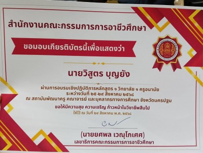 งานสวัสดิการนักเรียน นักศึกษา มอบหมายให้นายวิสุตร บุญยัง เข้าร่วมโครงการอบรมเชิงปฏิบัติการหลักสูตร ๑ วิทธาลัย ๑ ครูอนามัย ระหว่างวันที่ ๒๕ - ๒๙ สิงหาคม ๒๕๖๘ ณ สถาบันพัฒนาครู คณาจารย์ และบุคลากรทางการศึกษา ตำบลไร่ขิง อำเภอสามพราน จังหวัดนครปฐม