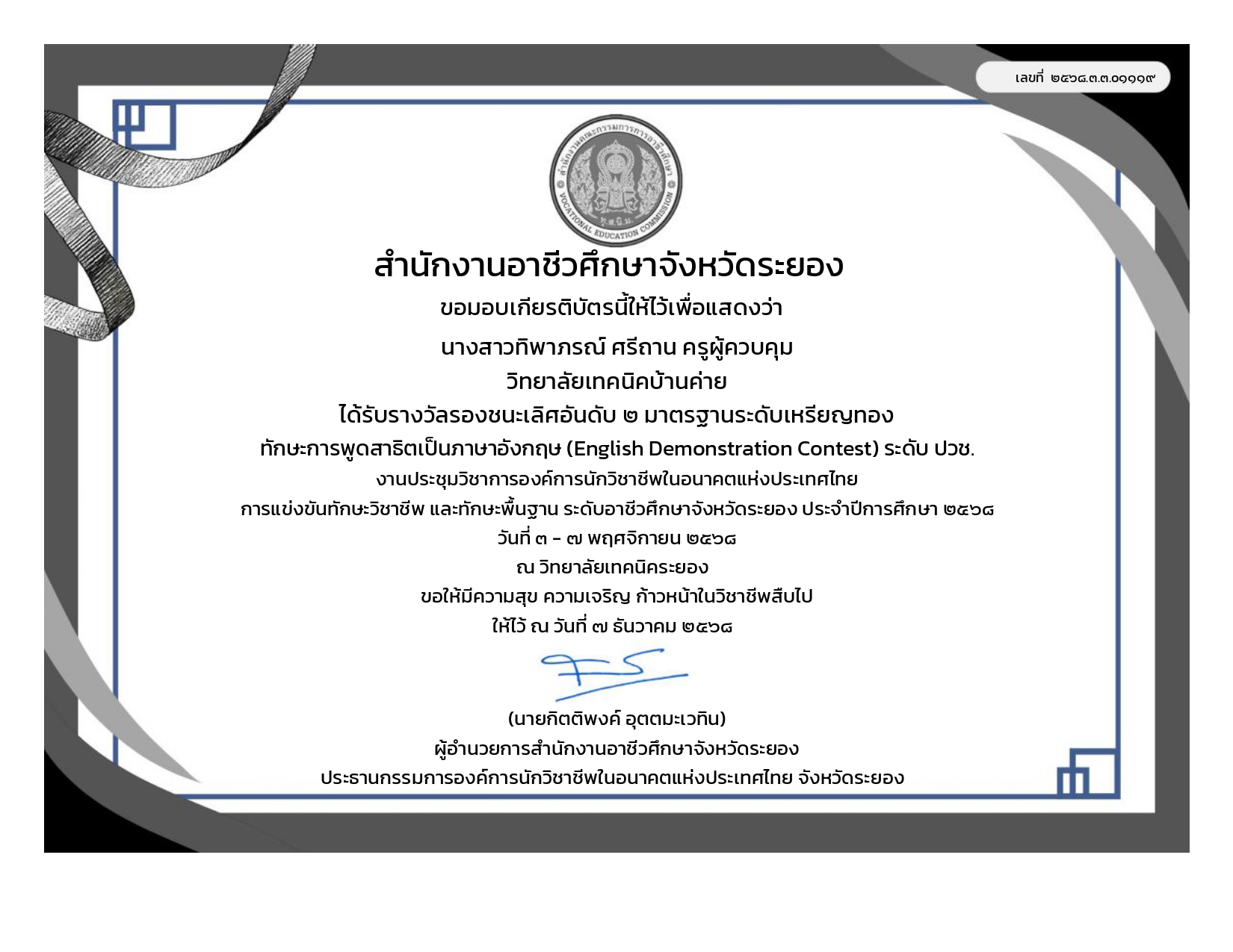 รางวัลรองชนะเลิศอันดับ 2 มาตฐานระดับเหรียญทองทักษะการพูดสาธิตเป็นภาษาอังกฤษ (English Demonstration Contest) ระดับ ปวช ครูผู้ควบคุม