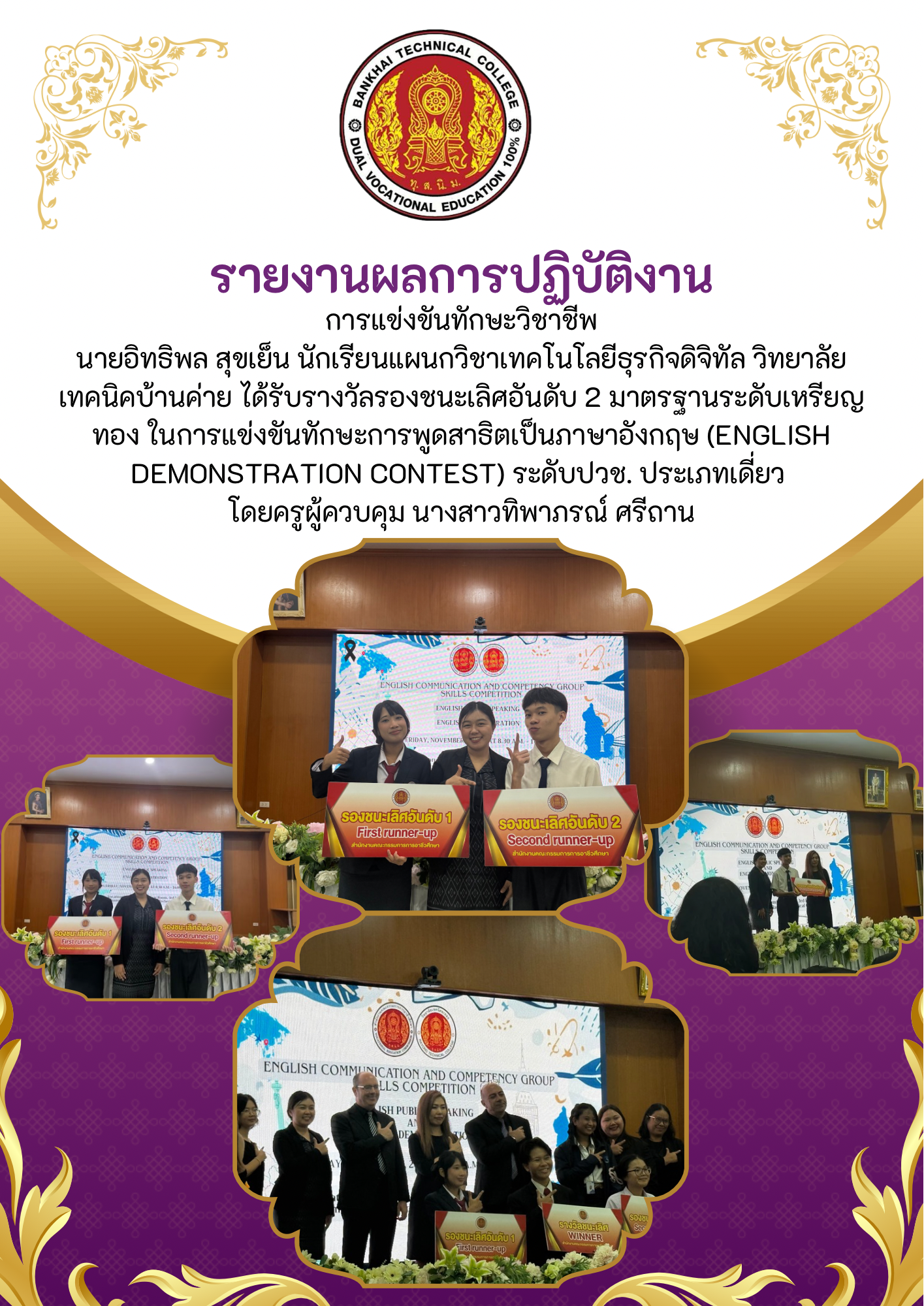 นายอิทธิพล สุขเย็น นักเรียนแผนกวิชาเทคโนโลยีธุรกิจดิจิทัล วิทยาลัยเทคนิคบ้านค่าย ได้รับรางวัลรองชนะเลิศอันดับ 2 มาตรฐานระดับเหรียญทอง ในการแข่งขันทักษะการพูดสาธิตเป็นภาษาอังกฤษ (English Demonstration Contest) ระดับปวช. ประเภทเดี่ยว โดยครูผู้ควบคุม นางสาวทิพาภรณ์ ศรีถาน