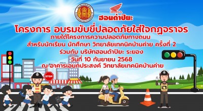 1 เดือน ที่ผ่านมางานโครงการพิเศษและบริการชุมชน ดำเนินโครงการความปลอดภัยทางถนน สำหรับนักเรียน รุ่นที่ ๒ ณ วิทยาลัยเทคนิคบ้านค่าย
