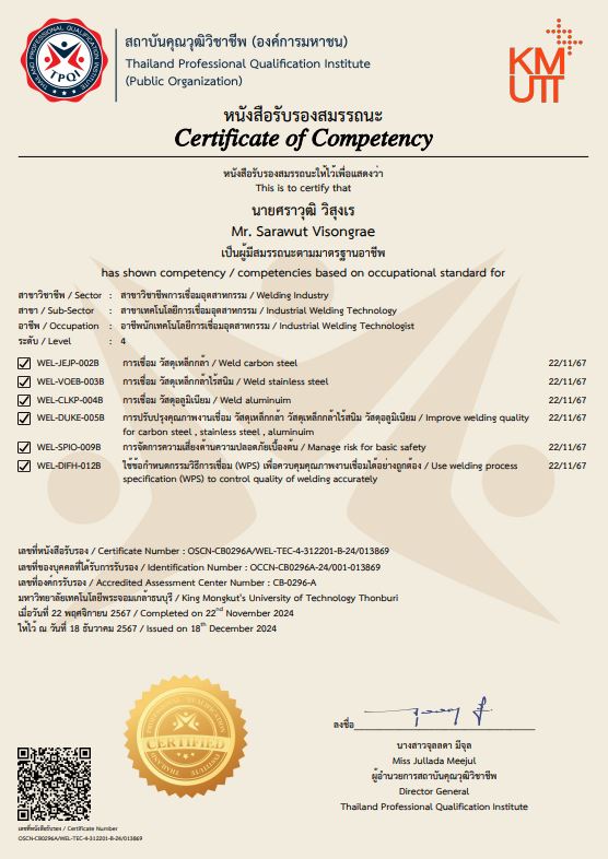 ได้รับคุณวุฒิวิชาชีพตามมาตรฐานอาชีพ สาขาเทคโนโลยีการเชื่อมอุตสาหกรรม อาชีพนักเทคโนโลยีการเชื่อมอุตสาหกรรม ระดับ 4