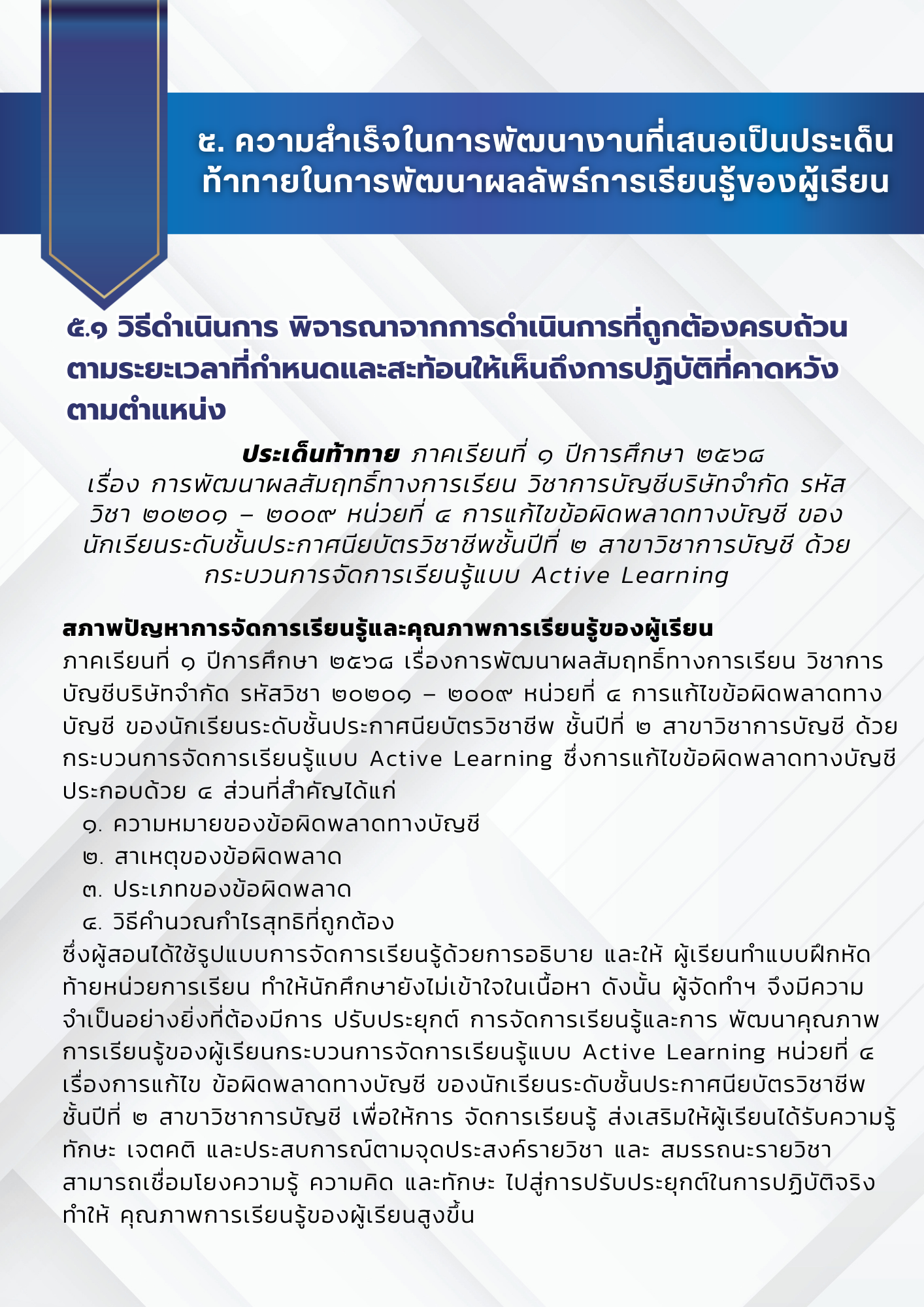 ๕.๑ วิธีดำเนินการ พิจารณาจากการดำเนินการที่ถูกต้องครบถ้วนตามระยะเวลาที่กำหนดและสะท้อนให้เห็นถึงการปฏิบัติที่คาดหวังตามตำแหน่ง