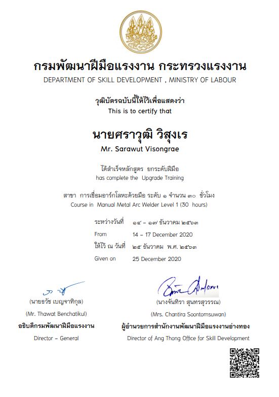 ได้สำเร็จหลักสูตรยกระดับฝีมือ สาขาการเชื่อมอาร์กโลหะด้วยมือระดับ 1