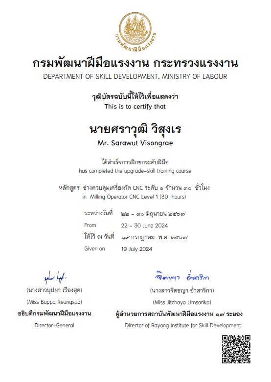 ได้สำเร็จหลักสูตรยกระดับฝีมือ ช่างควบคุมเครื่องกัด CNC ระดับ 1