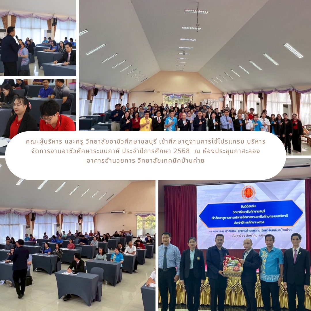คณะผู้บริหาร และครู วิทยาลัยอาชีวศึกษาชลบุรี เข้าศึกษาดูงานการใช้โปรแกรม บริหารจัดการงานอาชีวศึกษาระบบภาคี ประจำปีการศึกษา 2568 ณ ห้องประชุมกาสะลอง อาคารอำนวยการ วิทยาลัยเทคนิคบ้านค่าย